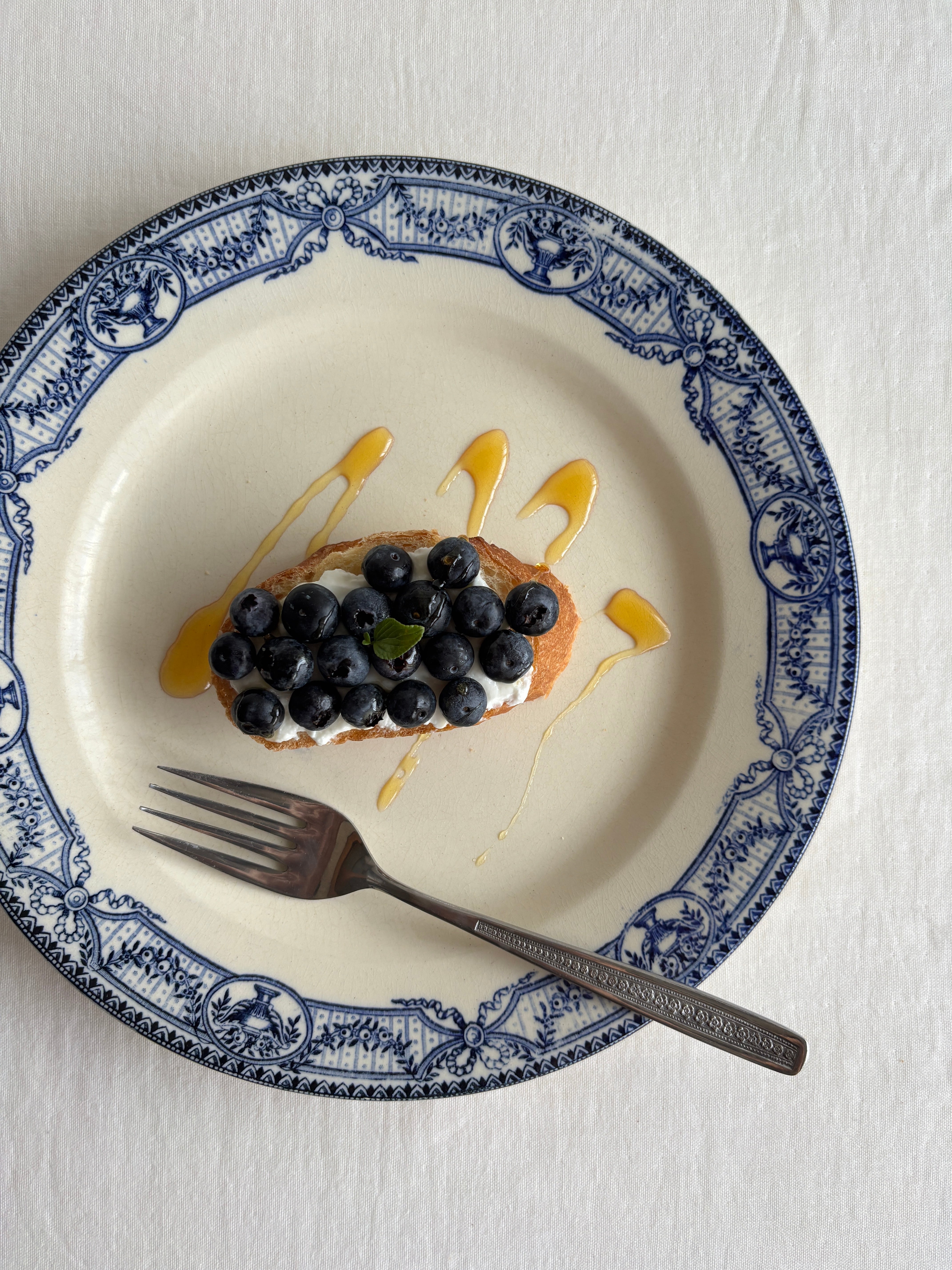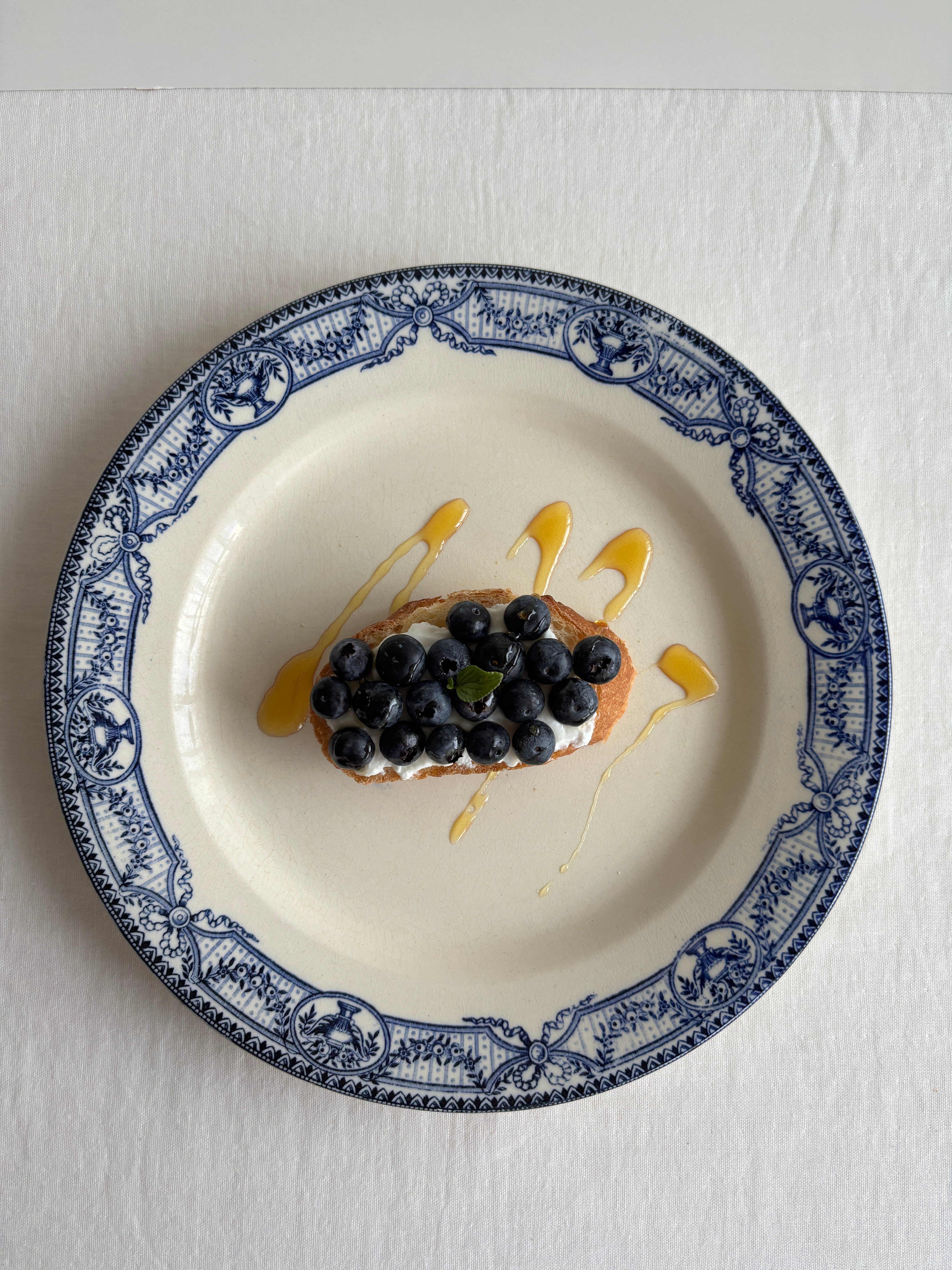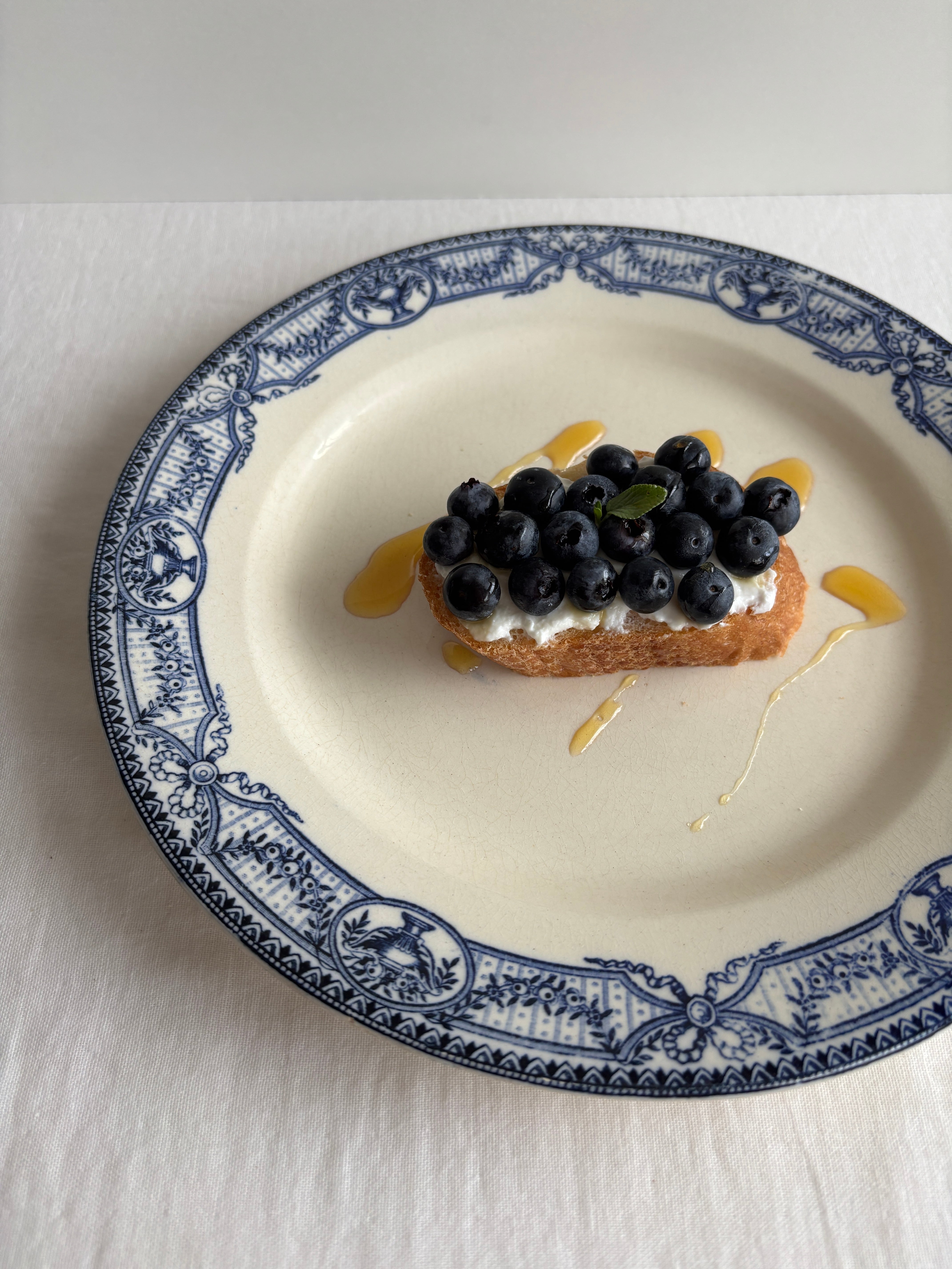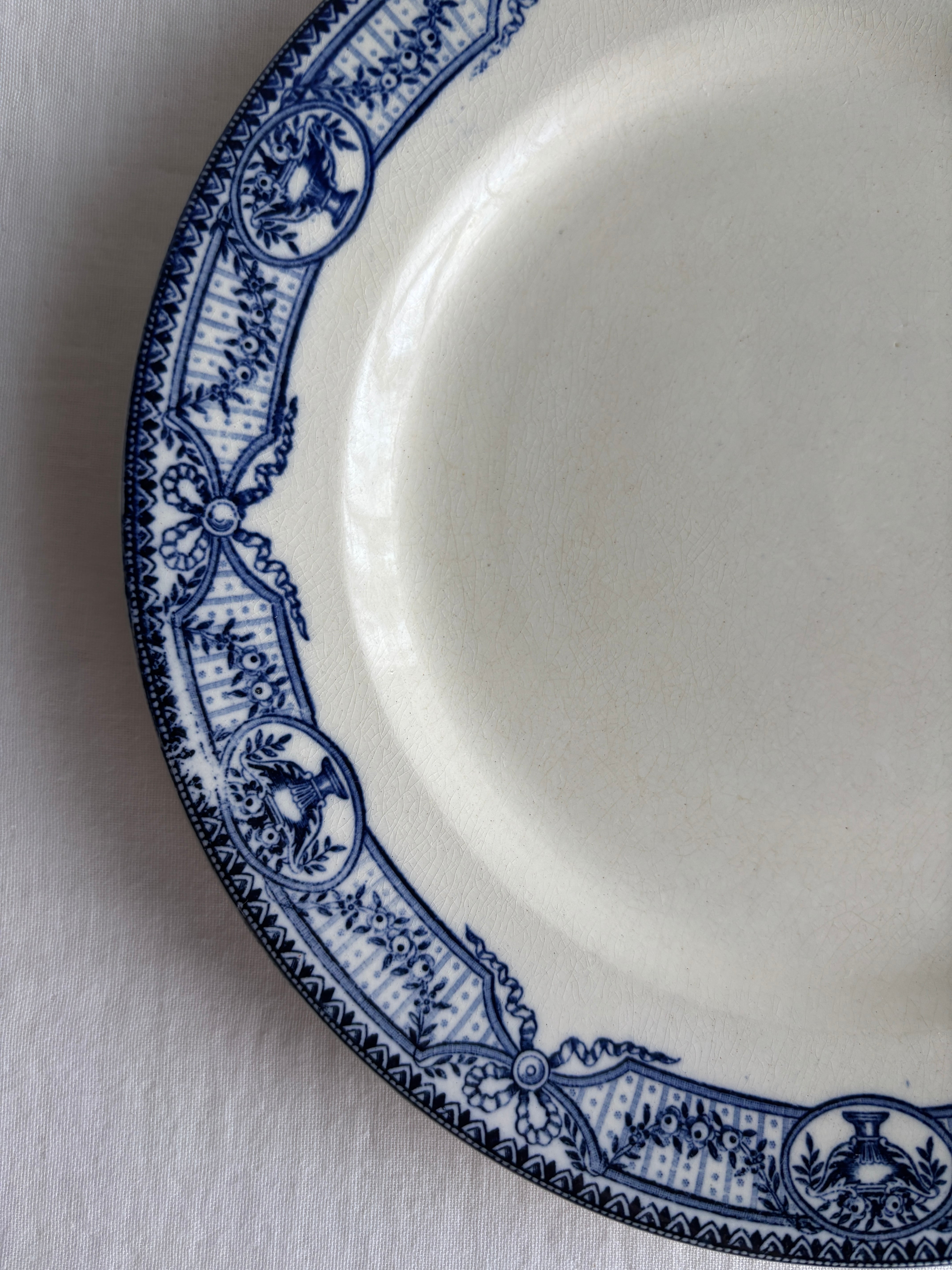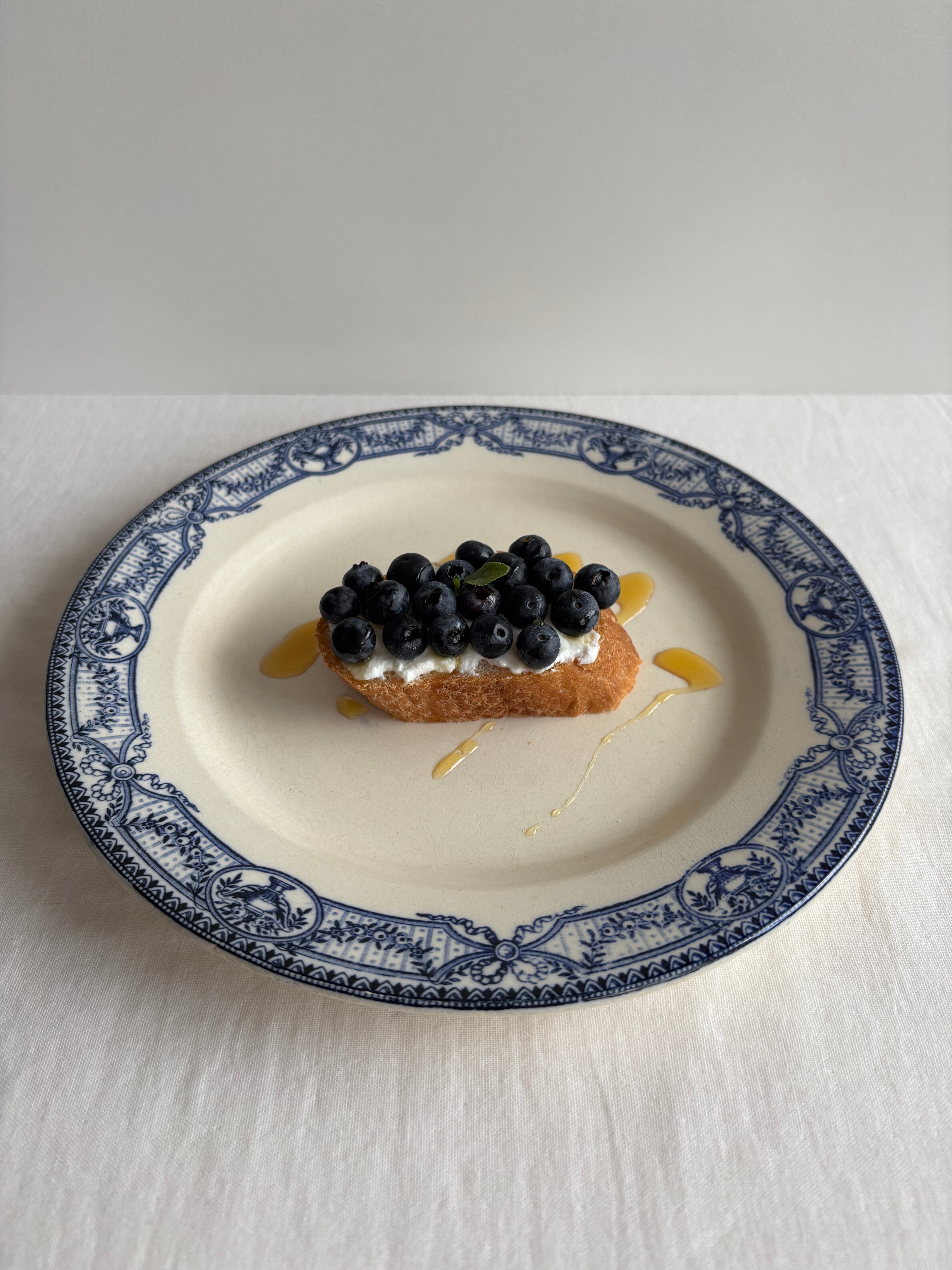 濃いブルーのリボンやお花のガーランドが華やかなディナープレート。