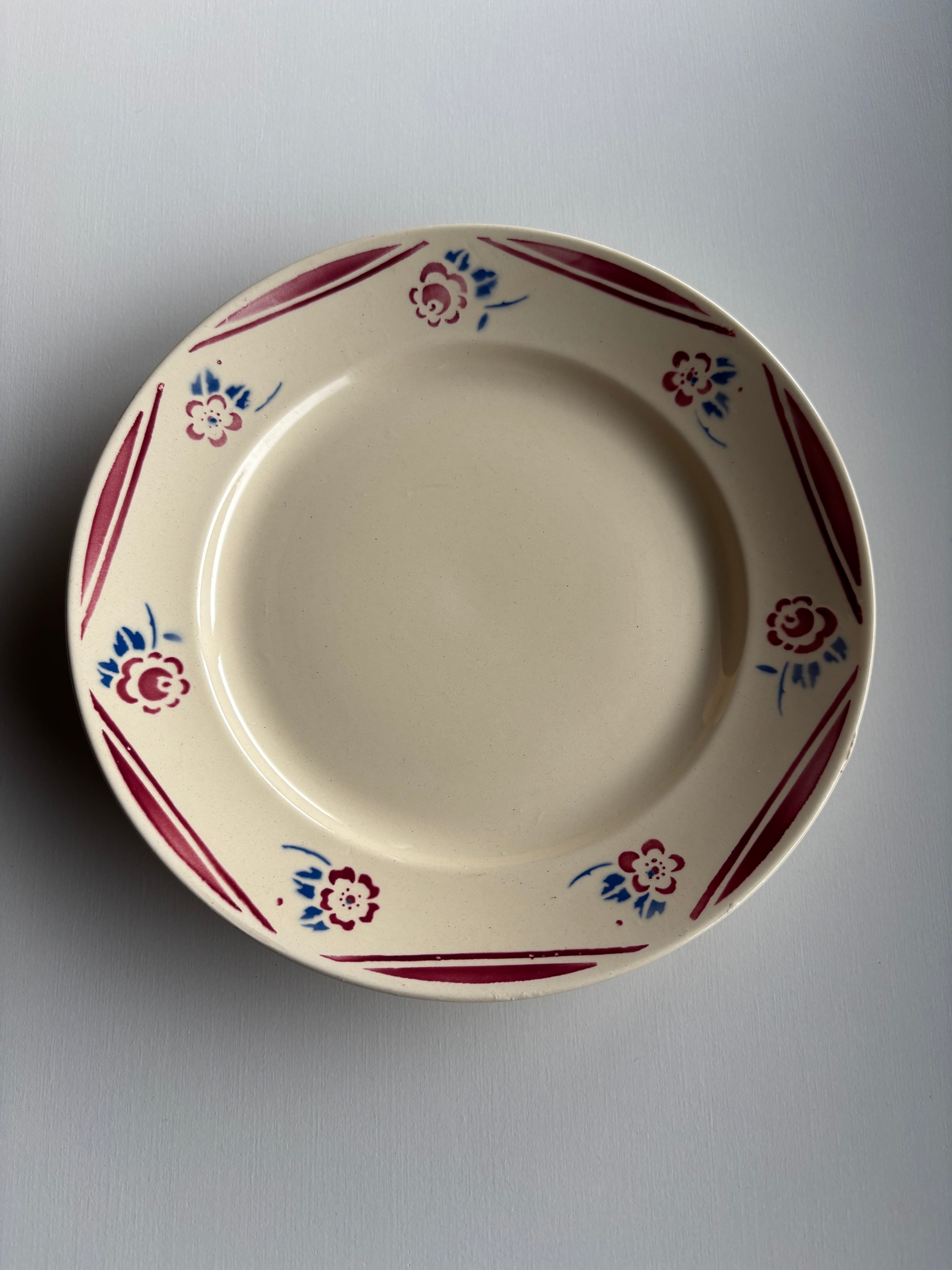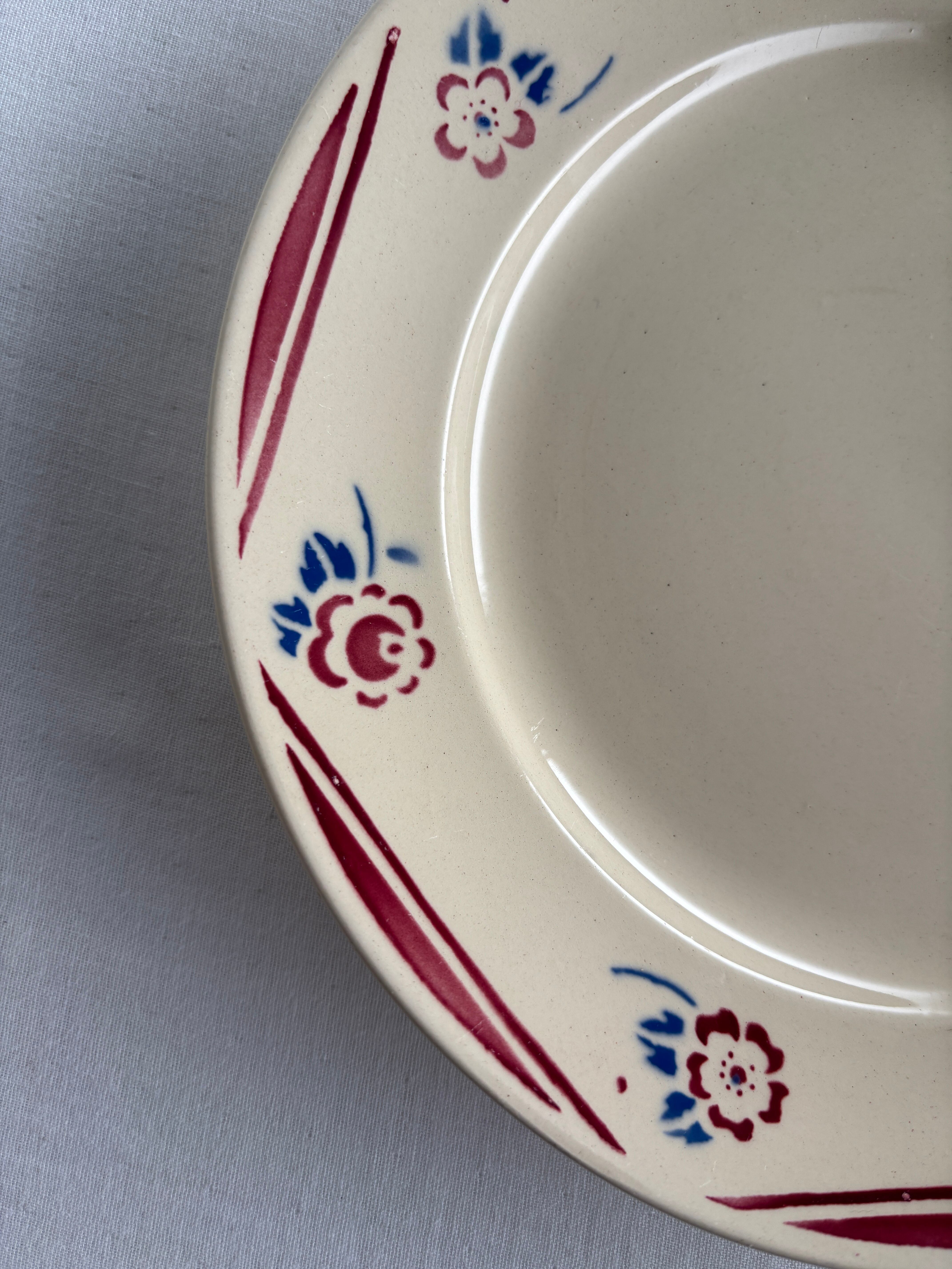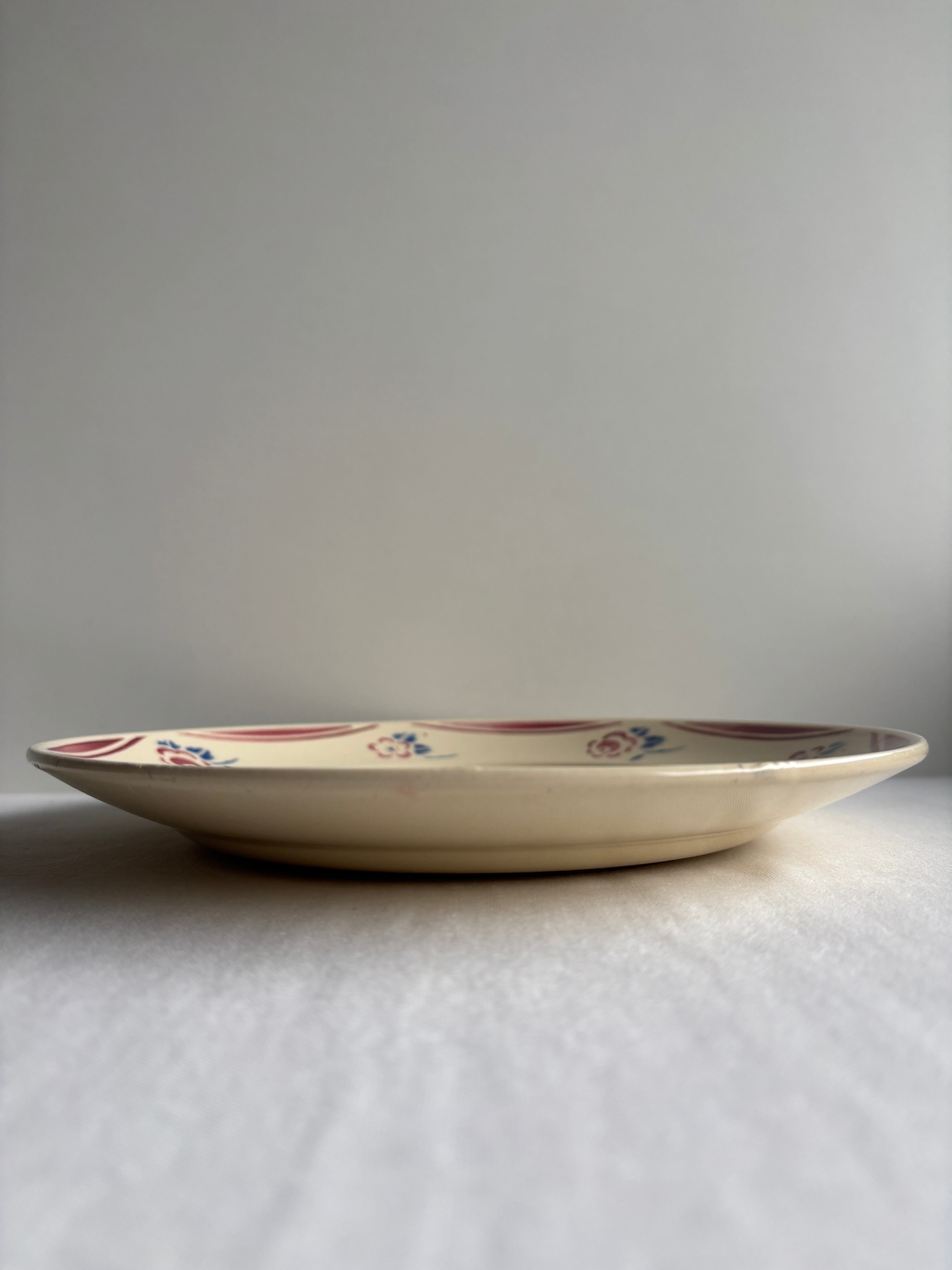 濃いクリーム色にリムを彩る赤いラインとお花の模様がとっても可愛いディナープレート。